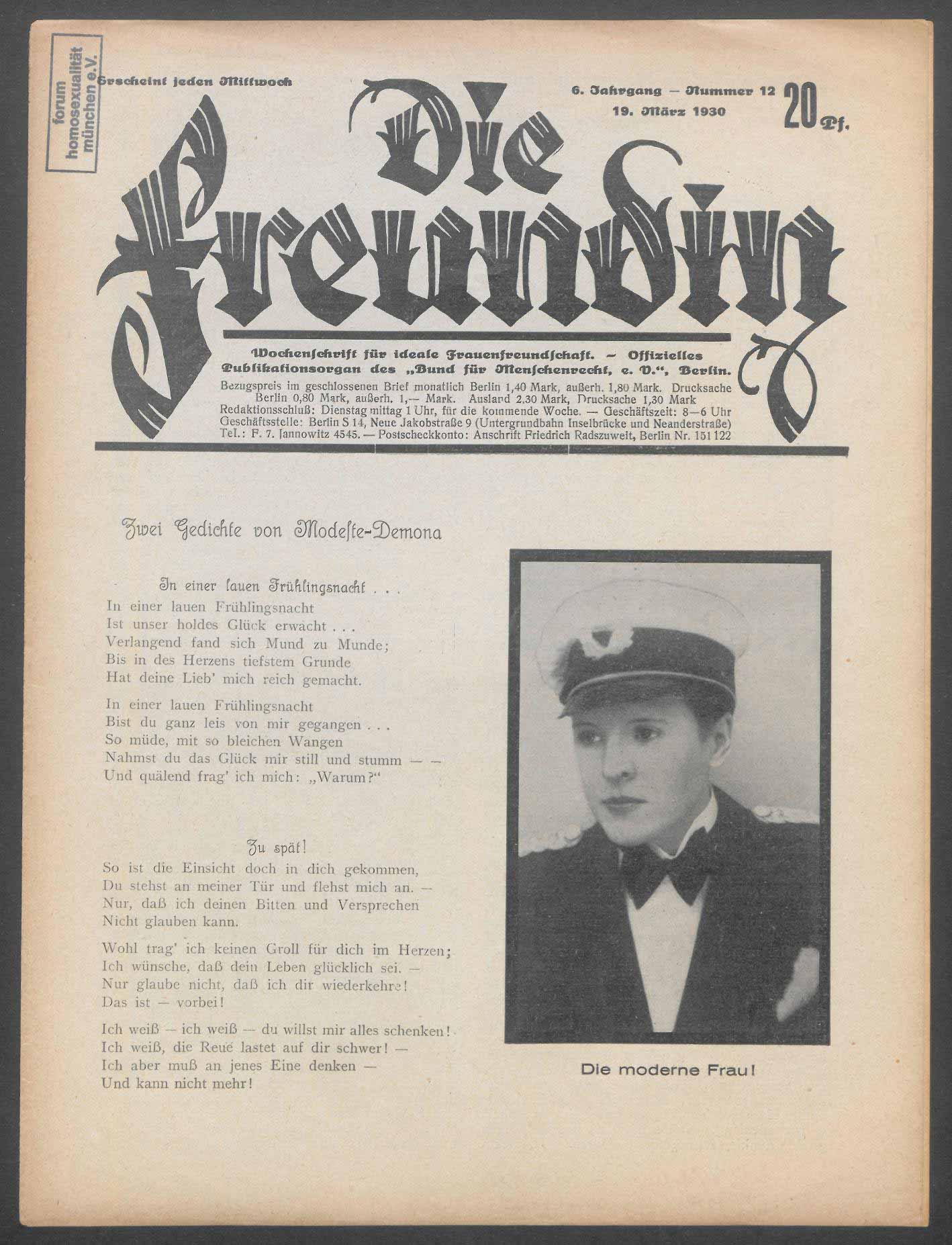 | Titelseite | 1 | Zwei Gedichte von Modeste-Demona | 1 | Zu spät! | 1 | Darf eine Frau Männerkleidung tragen? | 2 | Wie Hannelorle sich in einen Mann verliebte Ilse Schwarze | 2 | Und Rom zu meinen Füßen Selli Engler | 3 | Bis ins dritte und vierte Glied Charlotte Rex | 3 | Tagebuch der Zeit | 6 | Maskenball der Transvestiten! Lotte Hahm | 6 | Geographisches Silbenrätsel | 6 | Anzeigen | 7 |
