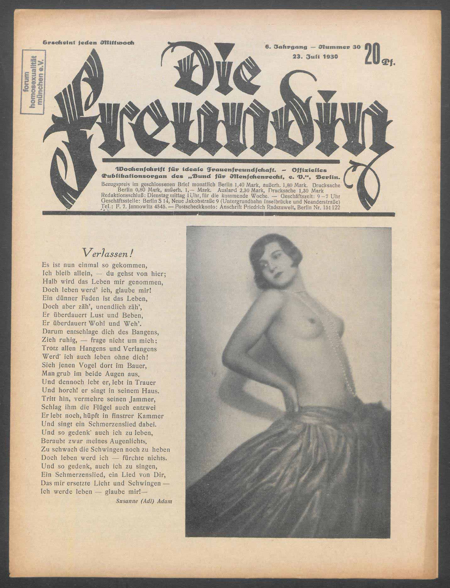 | Titelseite | 1 | Verlassen! Susanne Adam | 1 | Haben die Schupobeamten die Homosexuellen planmäßtg überfallen? Paul Weber | 2 | Schwester Nora Margot Müller | 3 | Du! Hate Fürstenberg | 5 | Der gute Weg! Hate Fürstenberg | 5 | Tagebuch der Zeiten | 5 | Intimer Abend unserer Transvestiten Lotte Hahm | 7 | Anzeigen | 7 |