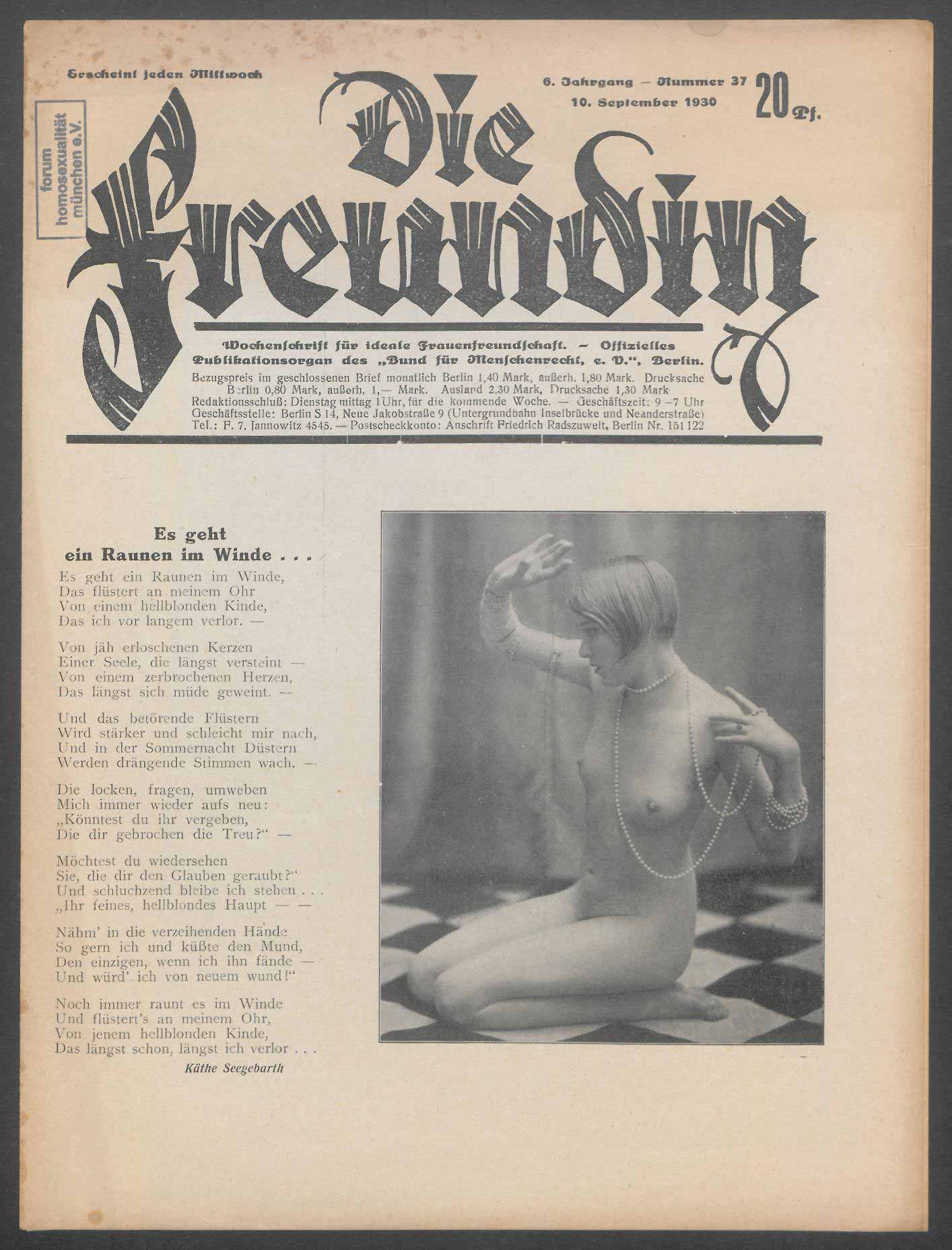 | Titelseite | 1 | Es geht ein Raunen im Winde… Käthe Seegebarth | 1 | Erlebnisse aus der Jugendzeit E. Killmer | 2 | Einsam Ilse St. | 4 | Arme kleine Jett Selli Engler | 4 | Die Welt der Transvestiten L.U. | 5 | „Kommt doch alle, alle lad´ ich ein – -!“ Selli Engler | 5 | Tagebuch der Zeit | 6 | Anzeigen | 6 |