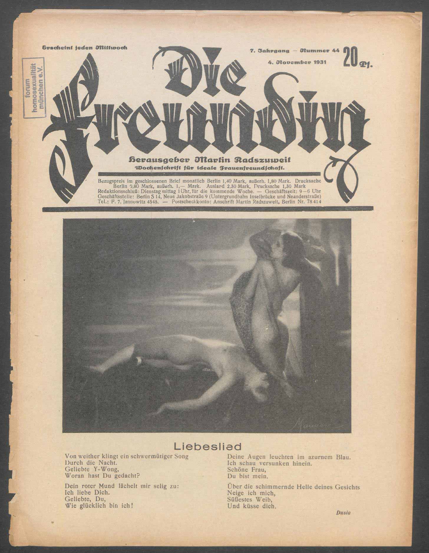 | Titelseite | 1 | Liebeslied Dusia | 1 | Warum lutscht der Säugling? Friedrich Radszuweit | 2 | Zigeunerkind hat niemand lieb… Hate Fürstenberg | 2 | Unrast Anny Hofmann | 4 | Brief an E. P. Sutro | 4 | Herbst Dusia | 5 | Auf der Insel der Freundinnen E. Zelenka | 5 | Ein Sonntag Lissy Kaelcke | 6 | Die Welt der Transvestiten O. | 6 | Die Welt der Transvestiten Anna Maria H. E. | 6 | Anzeigen | 7 |