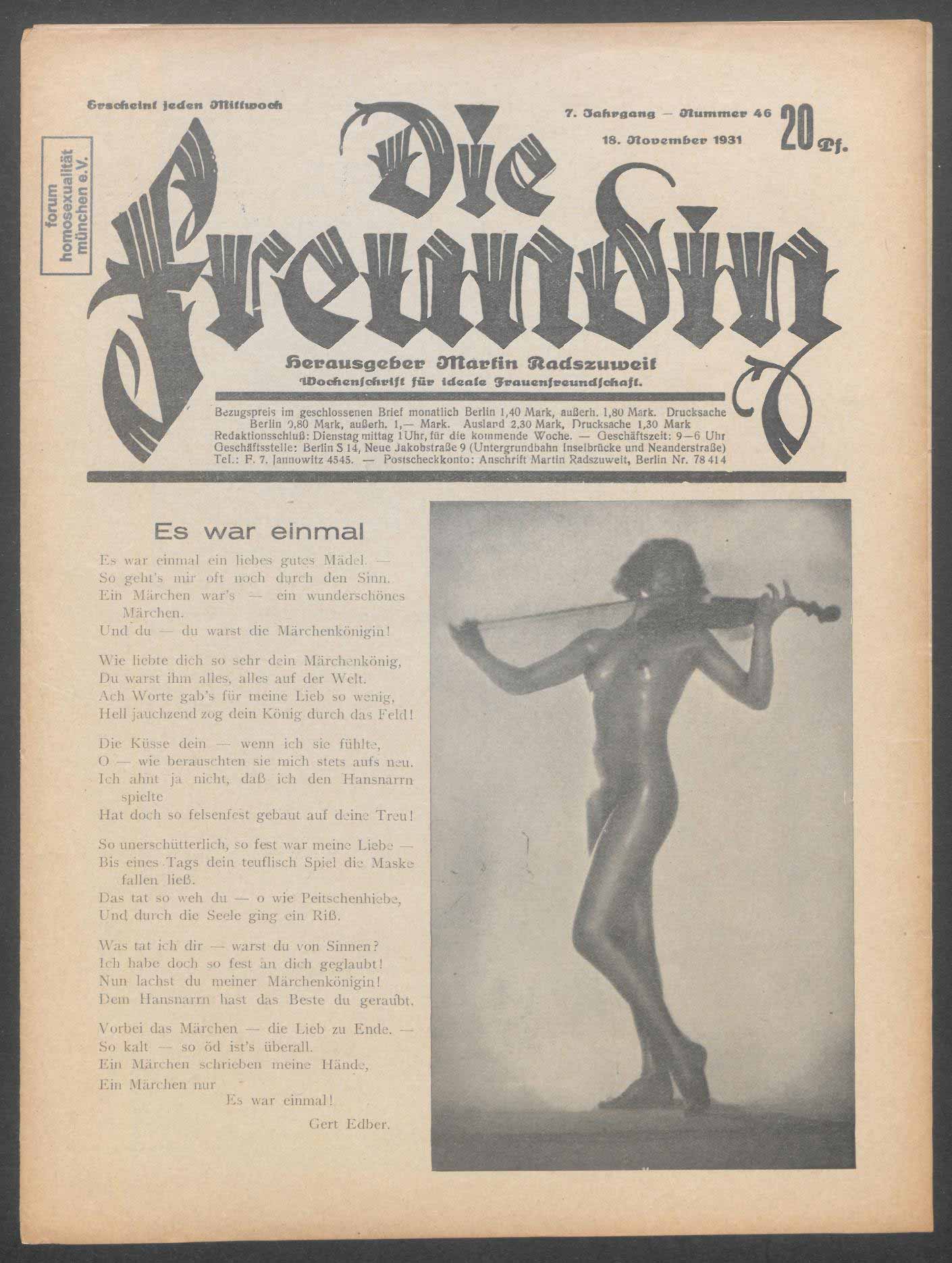 | Titelseite | 1 | Es war einmal Gert Edber | 1 | Tag der Toten Paul Weber | 2 | Dem Gedächtnis einer leiben Toten Anny Hofmann | 2 | Stimmung auf Rügen | 4 | Y-Wong Dusia | 4 | Eine Frau von Format Hansi | 5 | Die Welt der Transvestiten Anny W. | 6 | Interessante Tatsachen „Märkische Volkszeitung“ | 6 | Was die Freundin wissen muß! Peer | 6 | Altkunstbücher | 7 | Anzeigen | 7 |