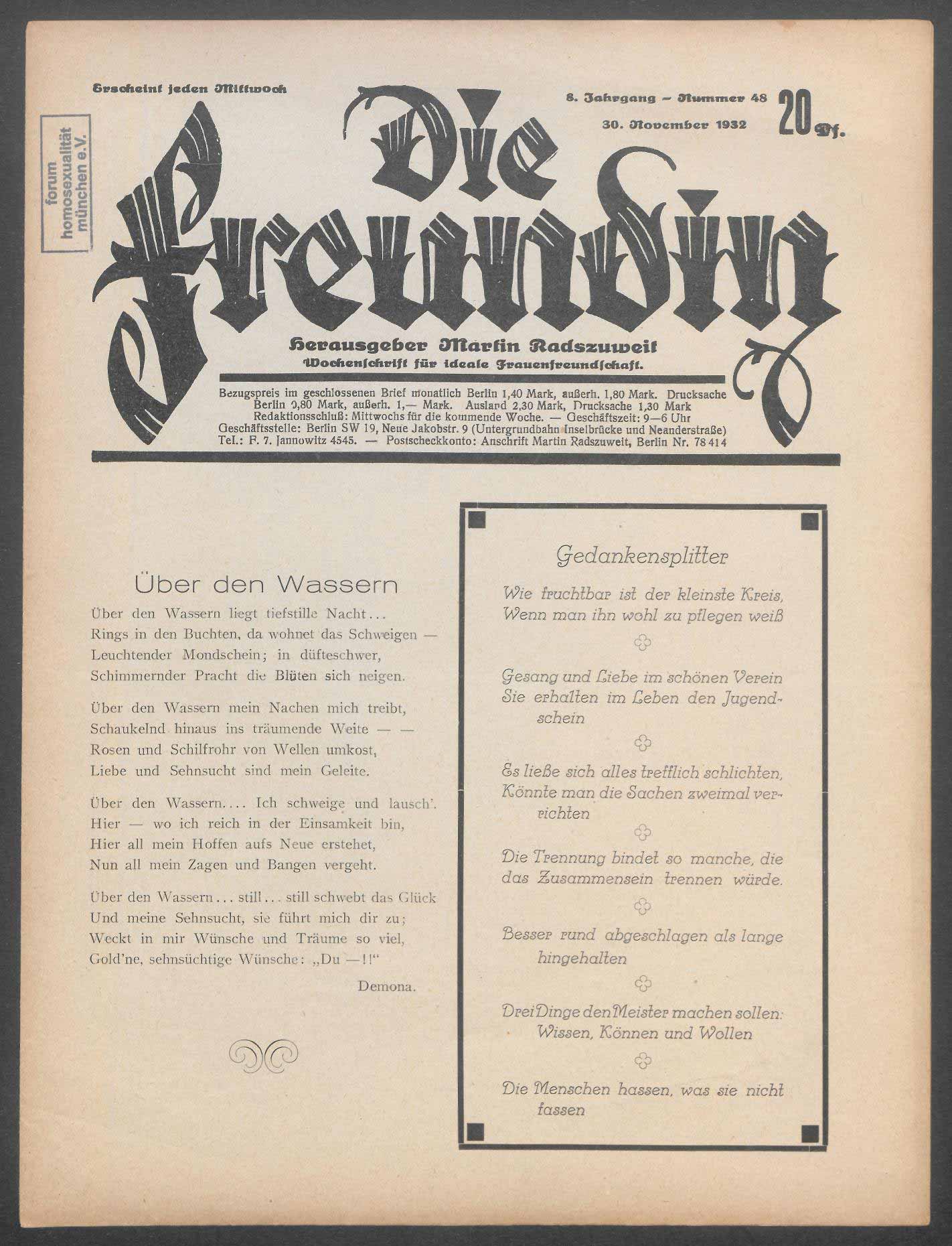 | Titelseite | 1 | Über den Wassern | 1 | Gedankensplitter | 1 | Der Typ | 2 | Ich träum´ so gern… | 2 | Dich will ich E. B. | 2 | Die Freundin hat das Wort Erna | 5 | Das Fräulein Jutta F. | 5 | Anzeigen | 7 |