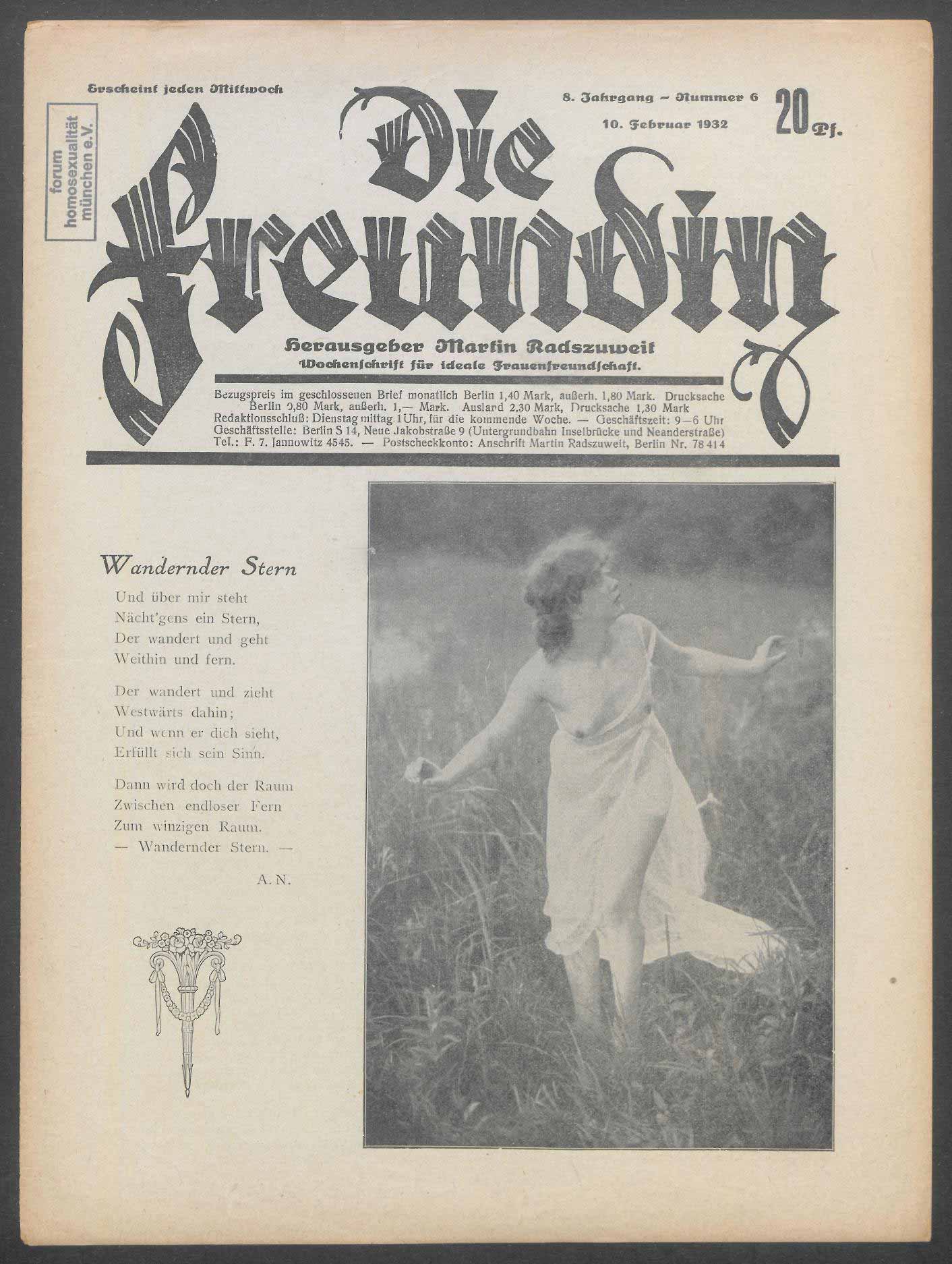 | Titelseite | 1 | Wandernder Stern A. N. | 1 | Oberstaatsanwalt Hagemann, Köln Friedrich Radszuweit | 2 | Finale O. | 2 | Der Gang nach Kanossa Töppsdrill | 3 | Schicksal Martl Schnell | 3 | Helly und die Liebe Ano Nymus | 4 | Auf den Bergen wohnt die Freiheit Annemarie Hornberger | 5 | Die Welt der Transvestiten Irene von D. | 6 | das Buch, das man der Freundin schenkt! | 7 | Anzeigen | 7 |