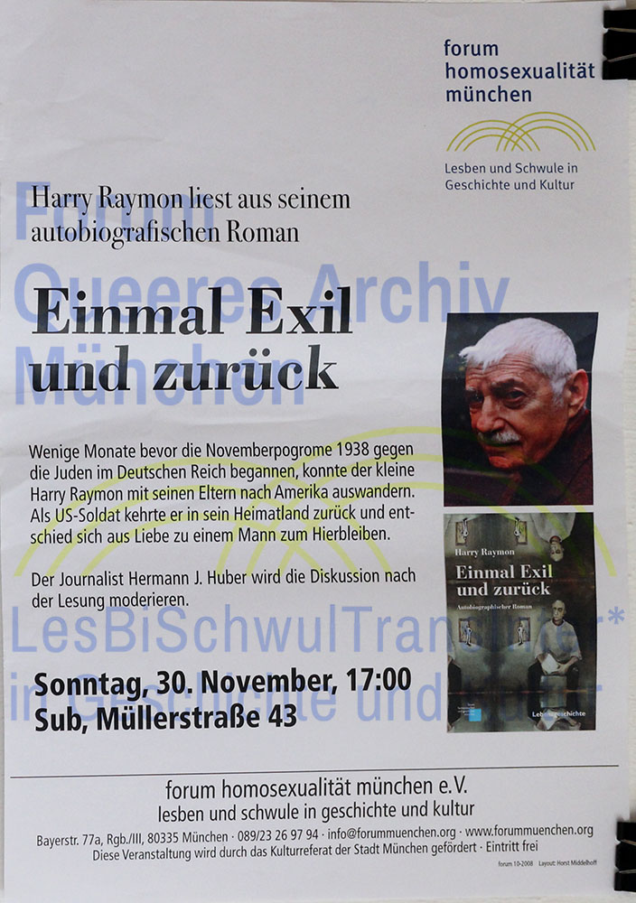 Schlagwörter: Forum, Harry Raymon, Lebensgeschichte, Lesung, Literatur, Müllerstraße, München, Nationalsozialismus, Schwule, SUB, Verfolgung