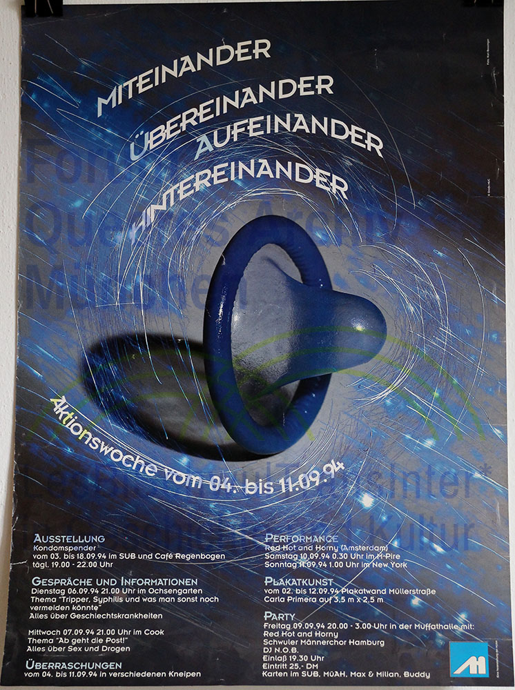 Schlagwörter: AIDS, AIDS-Hilfe, Ausstellung, Kondome, MüAH, München, Münchner Aids-Hilfe, Party, Performance, Safer Sex, Schwule