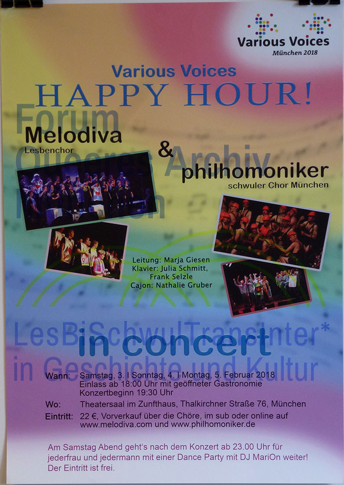 Schlagwörter: Chor, Chorfestival, Lesben, Lesbenchor, Melodiva, München, Musik, Philhomoniker, Schwule, Schwulenchor, Thalkirchner Straße, Various Voices, Zunfthaus